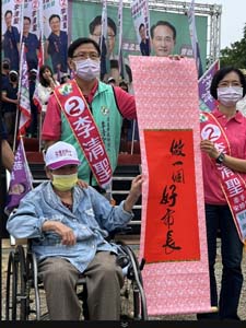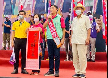 大會由名嘴余莓莓主持,李清聖母親授阿母期待「做一個好市長」中堂,前國策顧問楊四海遺孀授戰旗。