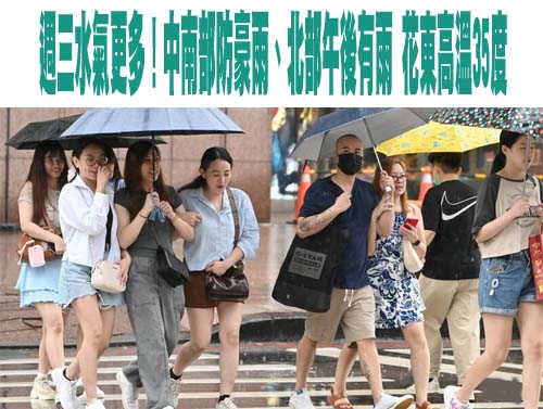 週三(9日)低壓帶及西南風影響,中南部地區有陣雨或雷雨,下雨時間長並可能有局部豪雨,其他地區也有短暫陣雨或雷雨,午後北部地區及東半部山區有局部大雨發生的機率;氣溫方面,各地高溫約30至33度。