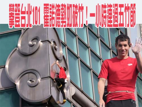 美國極限攀岩好手艾力克斯霍諾德(Alex Honnold)今天早上9點準時挑戰徒手攀爬台北101,他於10點21分站上第八層竹節頂端平