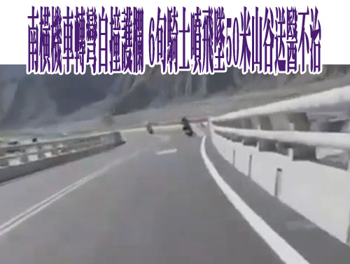 高市黃姓男子等3人各自騎機車出遊,行經台20線南橫路段勤和路段,黃男疑車速過快,轉彎失控撞護欄,人彈飛掉落50公尺深山谷,當場沒有生命跡象,送旗山醫院搶救仍宣告不治。