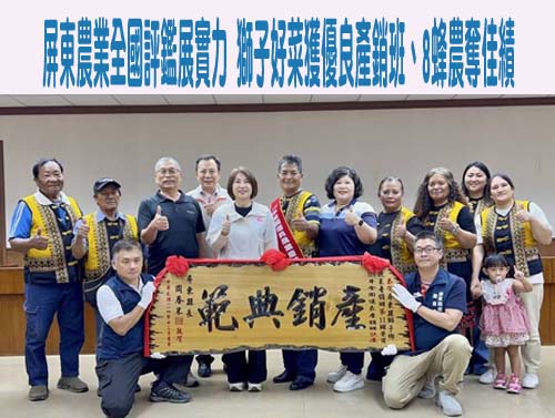 屏東縣農業在全國選拔與評鑑奪佳績,獅子鄉蔬菜產銷班第11班攜手4個部落推出「獅子好菜」品牌,榮獲全國優良農業產銷班,全縣也有8位蜂農在全國國產蜂蜜品質評鑑中摘下3個特等獎、5個頭等獎佳績,屏東縣長周春米今(23)日頒獎表揚,肯定他們為屏東爭光。
