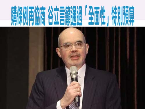 行政院提出8年新台幣1.25兆元軍購特別預算,但朝野對匡列金額有不同主張。立法院朝野黨團今天下午將再協商特別條例草案,美國在台協會處長谷立言表示,台灣通過「全面性」特別預算條例非常重要,這是向國際發出重要信號。